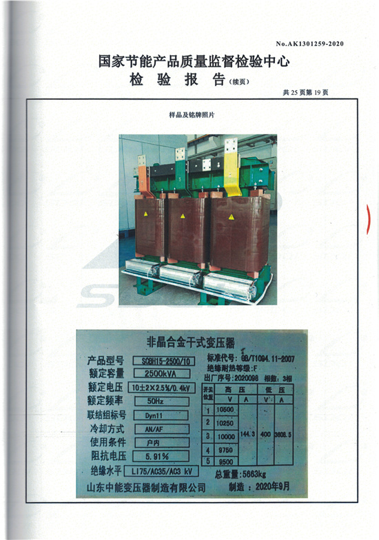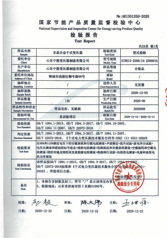 SCBH15非晶合金干式變壓器檢驗報告